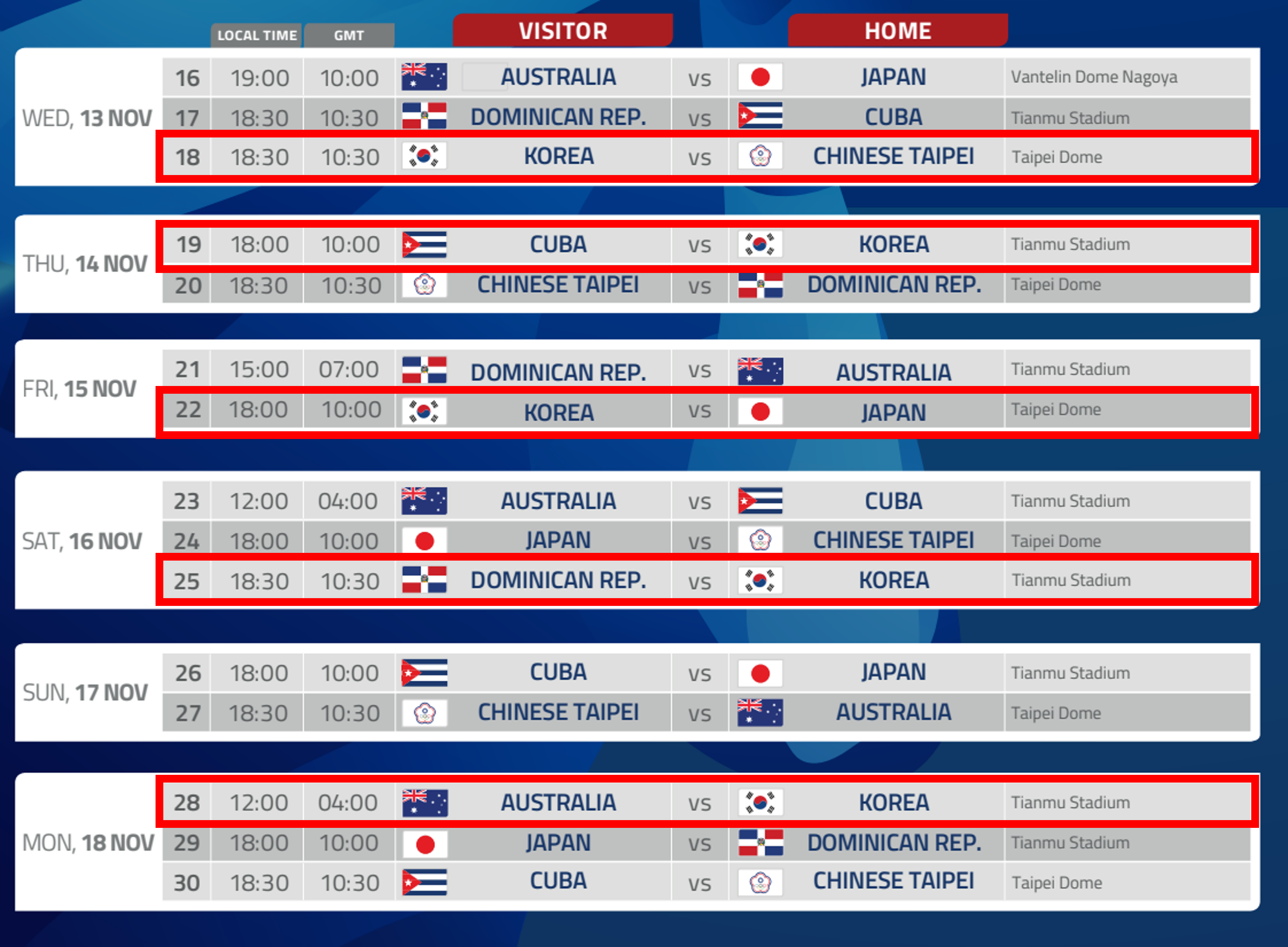 대만의 Tianmu Stadium과 Taipei Dome에서 각각 개최된다.