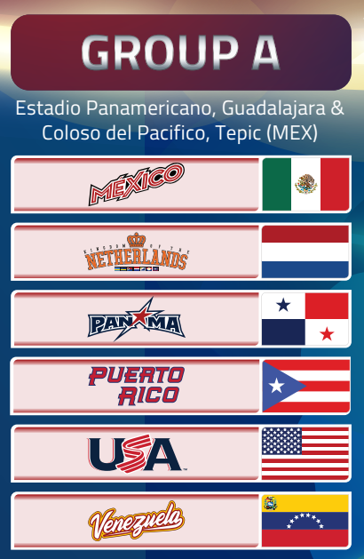 A조는 예선전 주최국 멕시코, 네덜란드, 파나마, 푸에리토리코, 미국, 베네수엘라