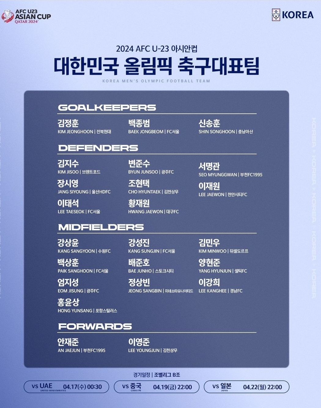 대한축구협회는 4월 15일 부터 개최되는 2024 AFC U-23아시안컵에 출전할 올림픽 축구대표팀 명단을 공개했다.