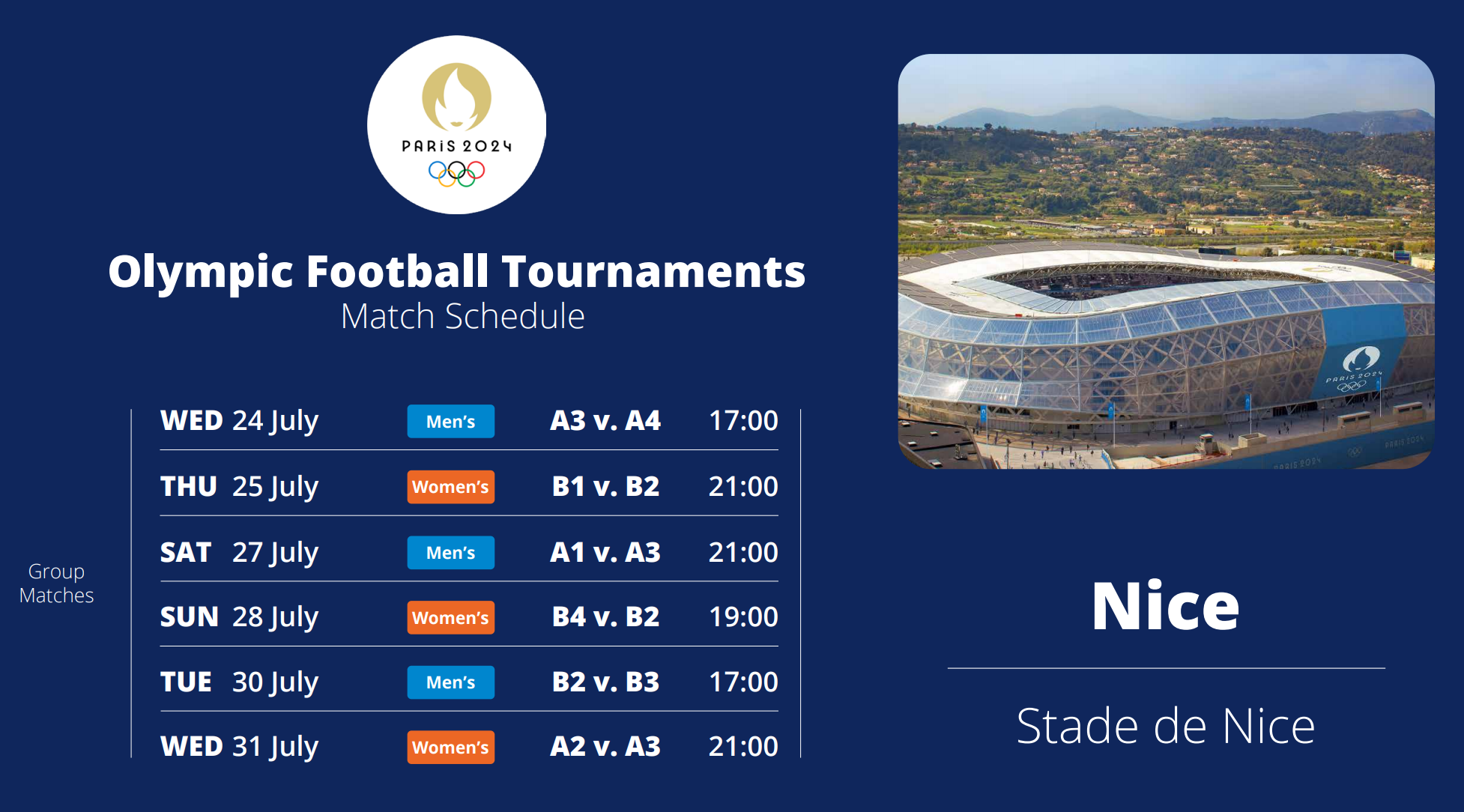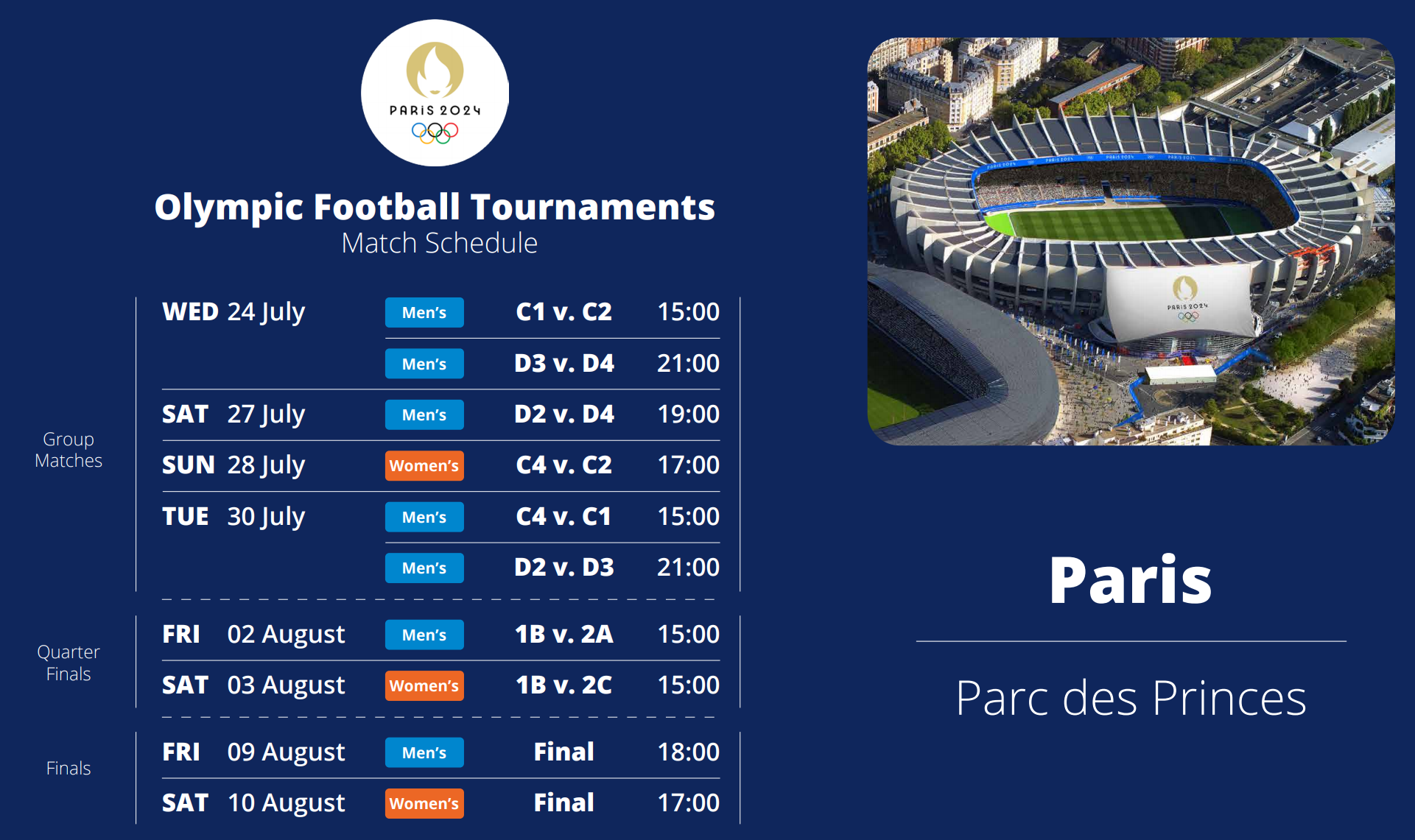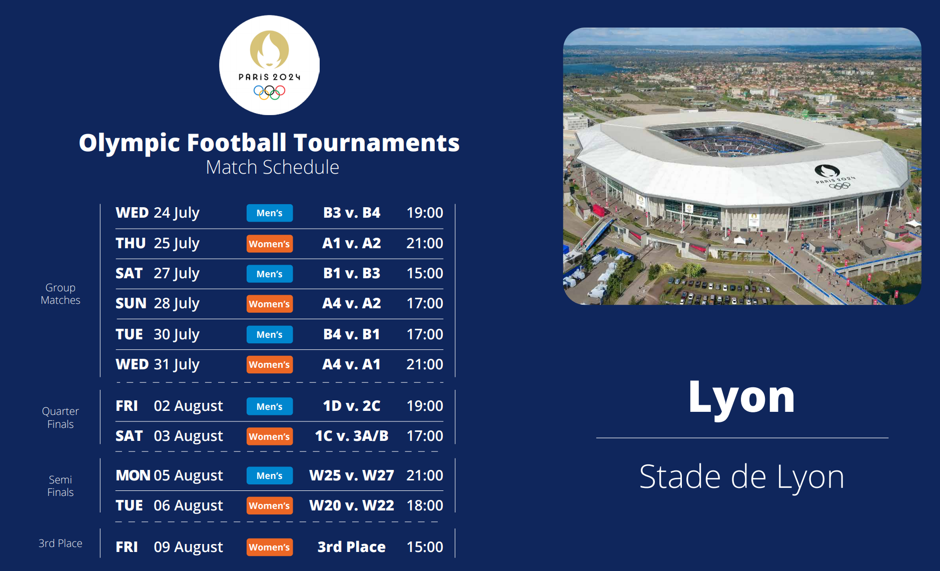 2024 파리올림픽 축구 경기는 7월 24일 부터 8월 9일까지 총 7개의 구장에서 개최된다.