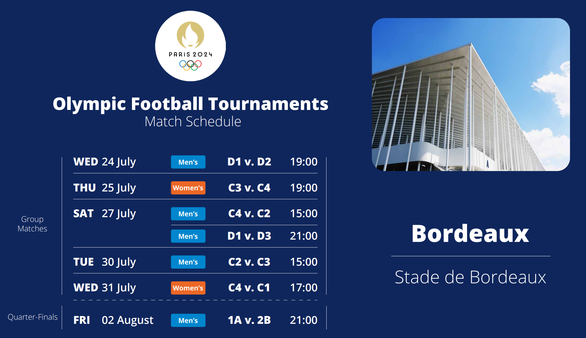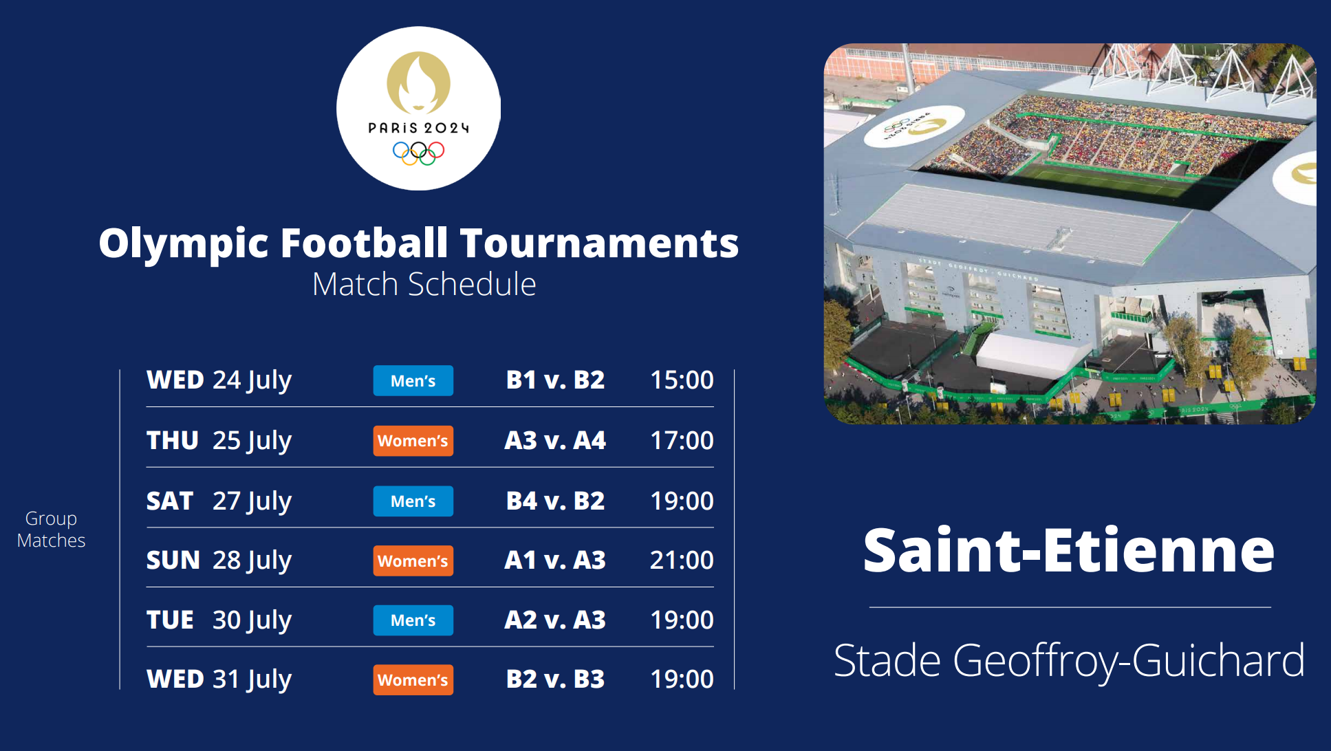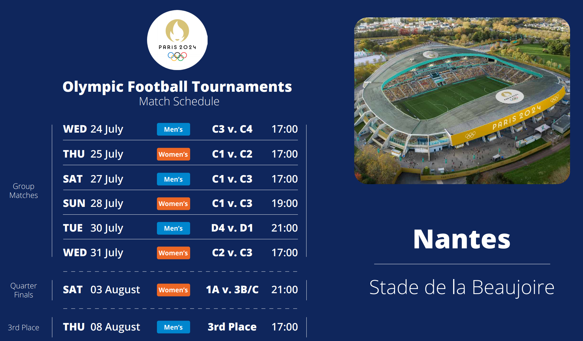 2024 파리올림픽 축구 경기는 7월 24일 부터 8월 9일까지 총 7개의 구장에서 개최된다.