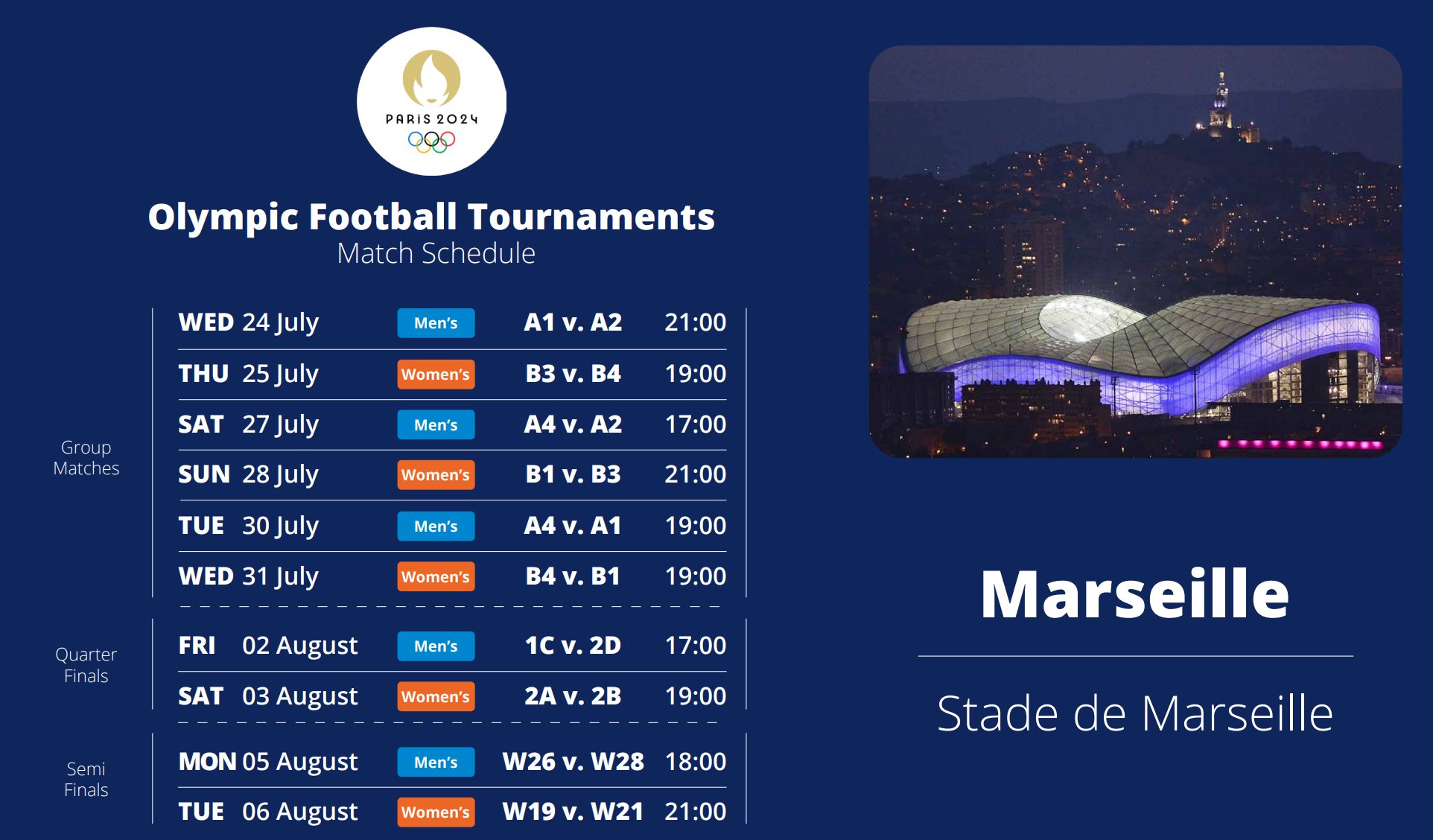 2024 파리올림픽 축구 경기는 7월 24일 부터 8월 9일까지 총 7개의 구장에서 개최된다.