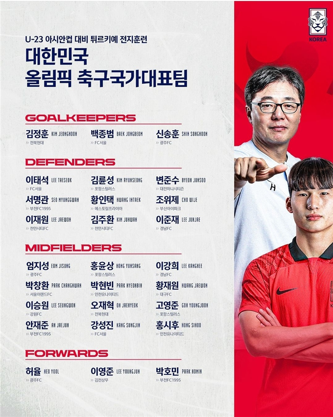 대한축구협회는 아직 올림픽 축구 명단을 확정하지 않았다. 대한민국 올림픽 축구 대표팀은 세계 최초 9회 연속 올림픽에 진출했으며 이번 2024 파리 올림픽에 10회 연속 올림픽 진출을 노린다. 황선홍호는 항저우 아시안게임 금메달에 이어 올림픽 진출 티켓까지 노린다. 대한민국 축구대표팀의 올림픽 최고 성적은 2012년 런던올림픽 동메달이다.
