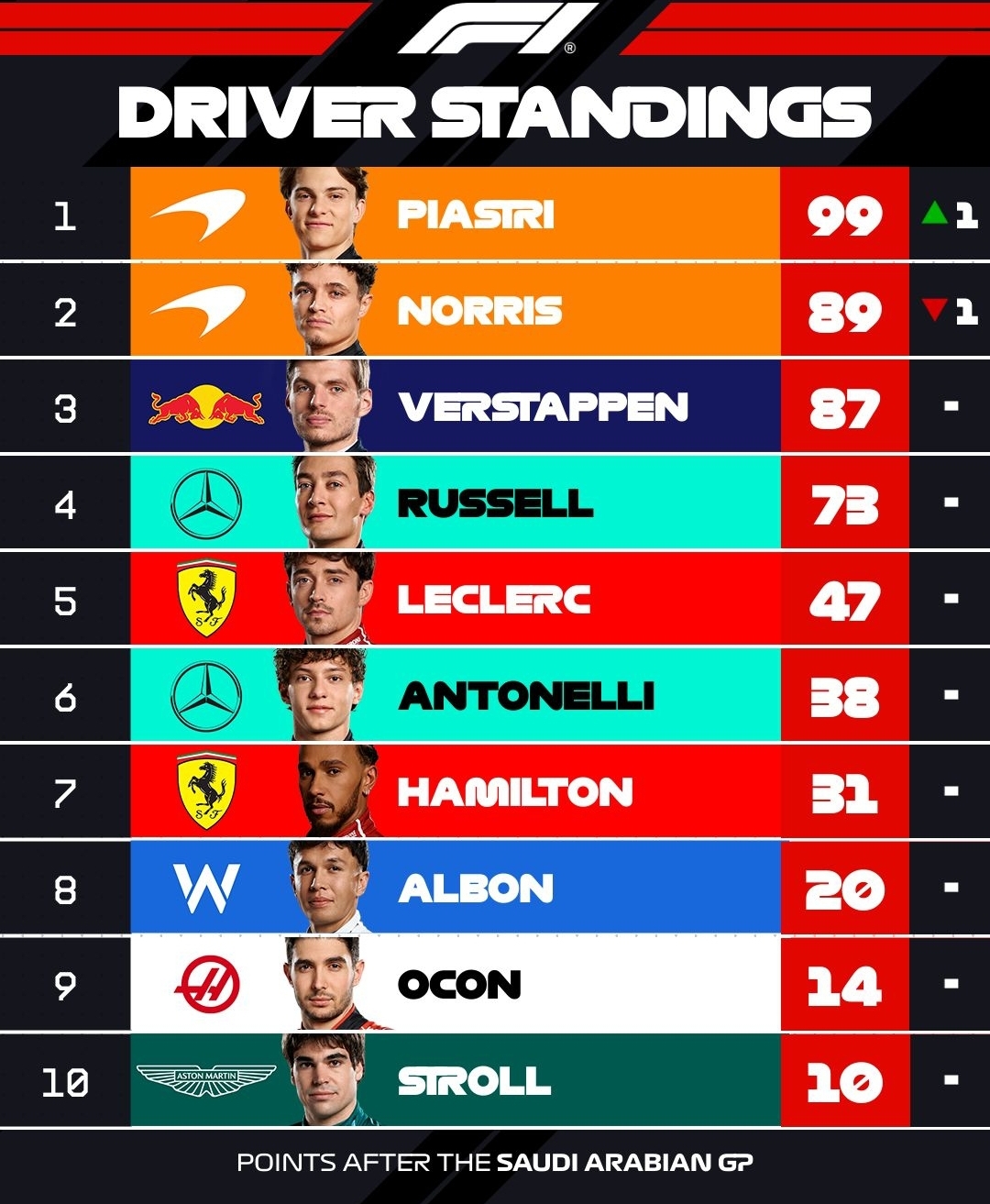 맥라렌이 팀 컨스트럭터 1위를 굳건히 지키고 있으며
