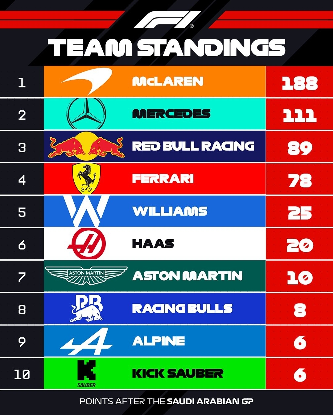 맥라렌이 팀 컨스트럭터 1위를 굳건히 지키고 있으며