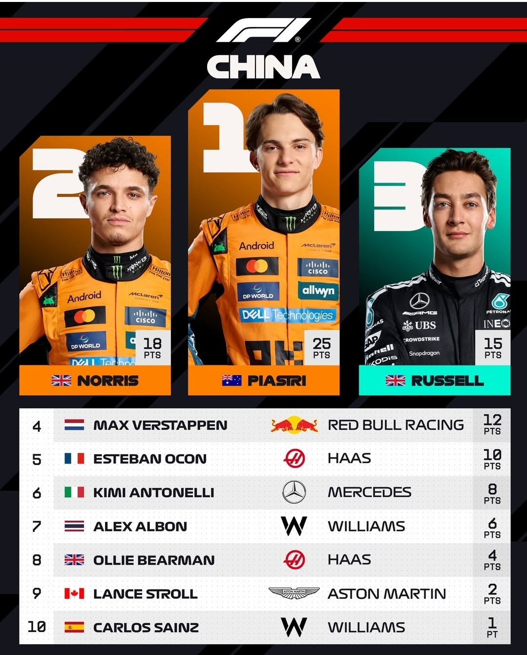 2025년 F1첫 스프린터는 2위와 6.889차이를 보인