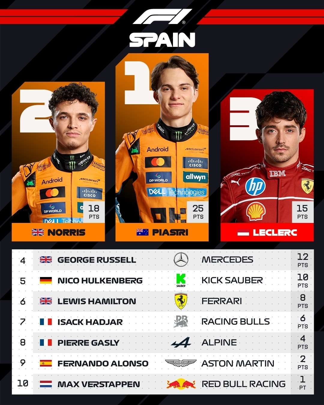 2025 F1 스페인 그랑프리 결과 : 오스카 피아스트리 우승