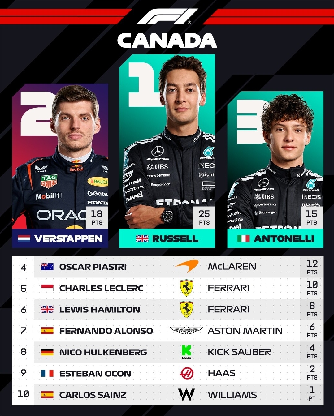 2025 F1 캐나다 그랑프리 결과 : 조지러셀 2025 첫 우승🏆