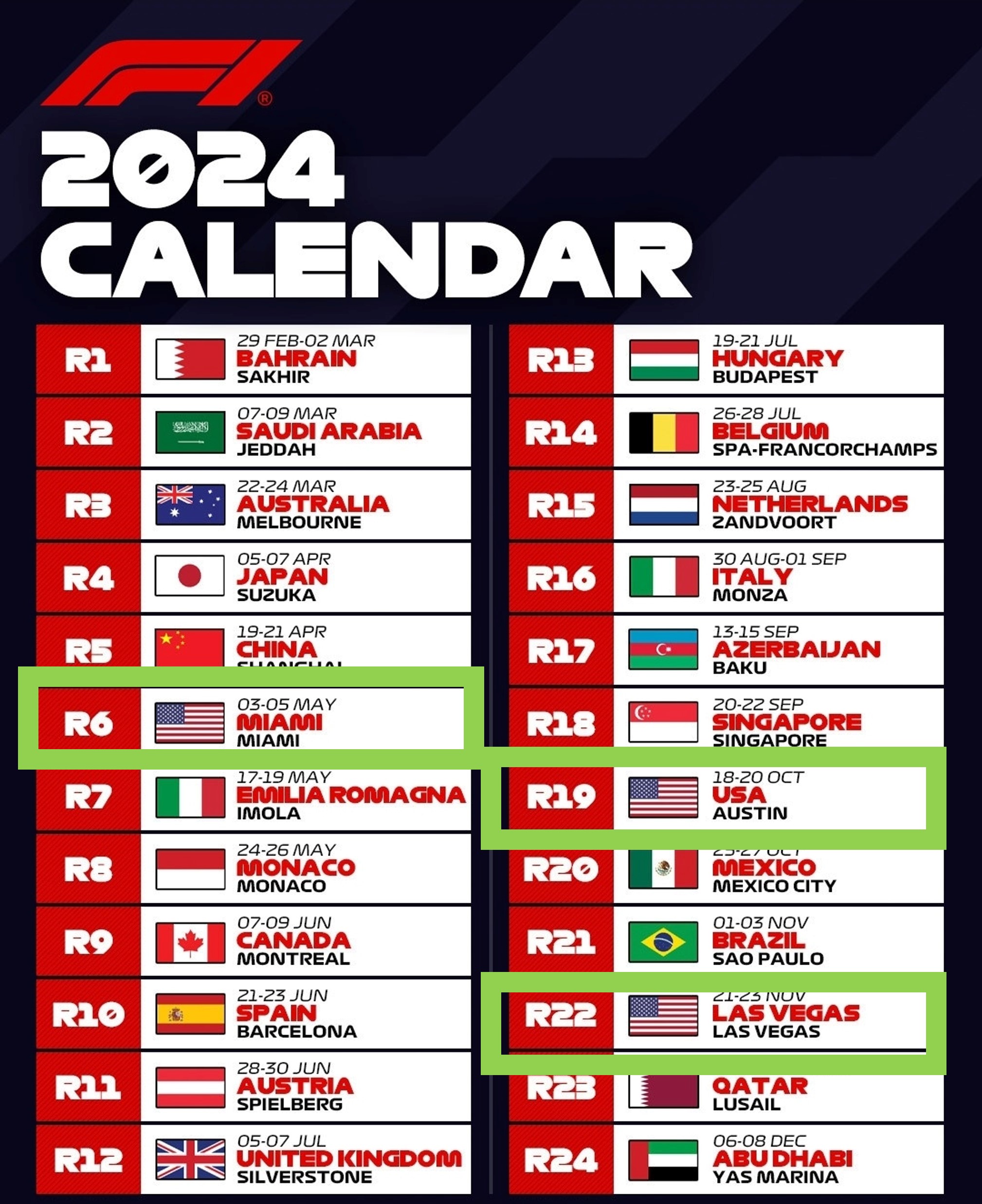 2024년 6번째 그랑프리가 5월 3일~5월 5일(3일) 미국 마이애미에서 개최됩니다. 이번 마이애미 대회는 2024년 미국에서 개최되는 첫 번째 그랑프리입니다. 미국은 2024년 3번의 F1그랑프리를 개최할 예정이며 10월 오스틴과 11월 라스베가스에서 개최됩니다.