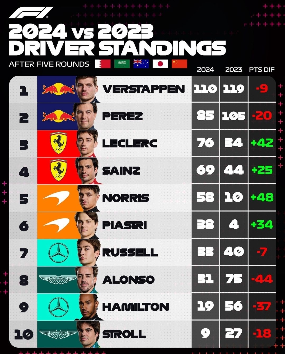 작년에 이어 올해도 레드불과 베르스타펜의 독주는 계속되고 있습니다. 5번의 레이스를 작년과 비교했을 때 9점 차로 포인트가 적지만 호주 그랑프리에서 브레이크 문제로 리타이어 한걸 생각하면 엄청난 결과라고 할 수 있습니다.