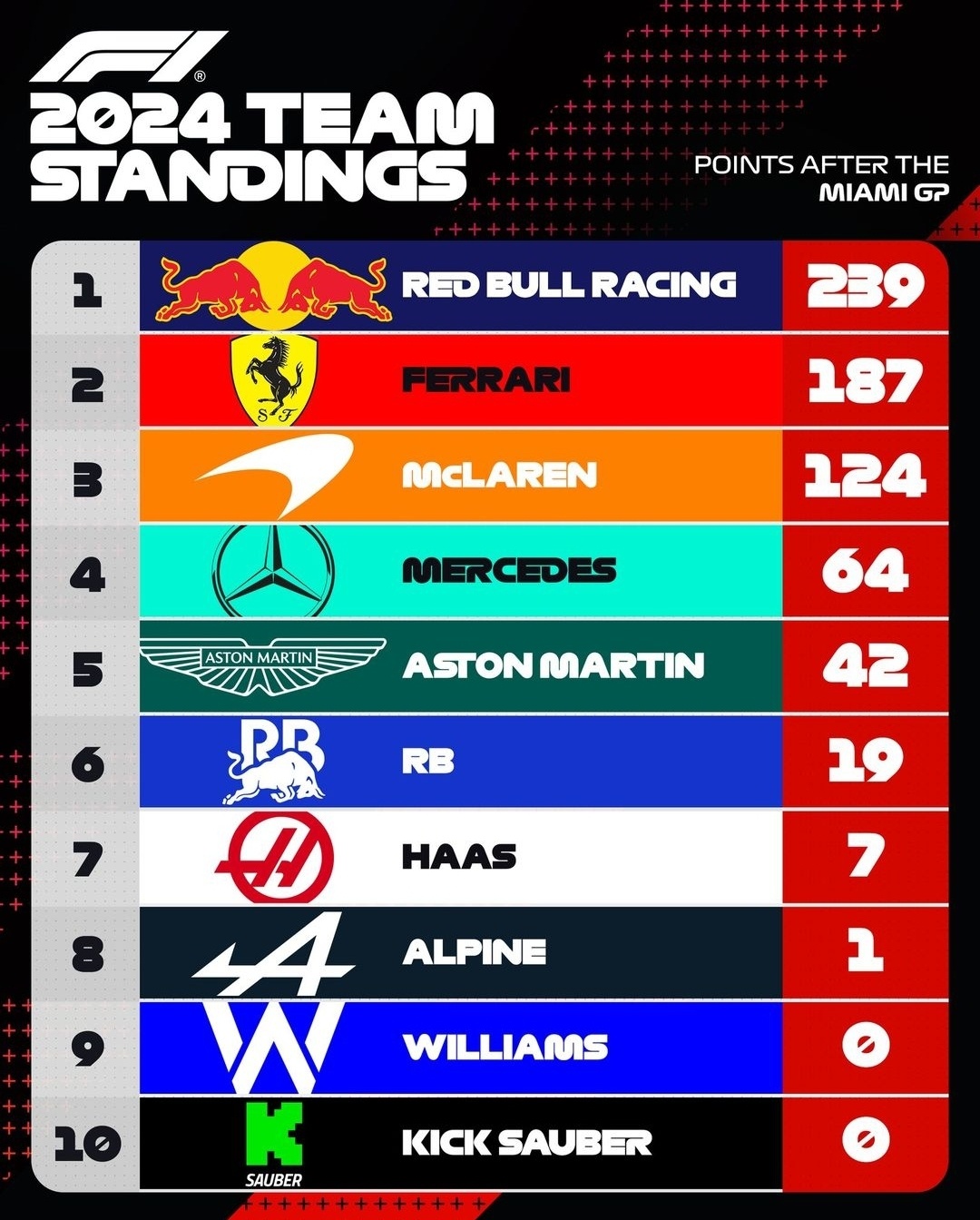 2024년 1/4 지점을 지난 현재까지 레드불의 두 드라이버 베르스타펜과 페레즈가 1,2등을 달리고 있으며