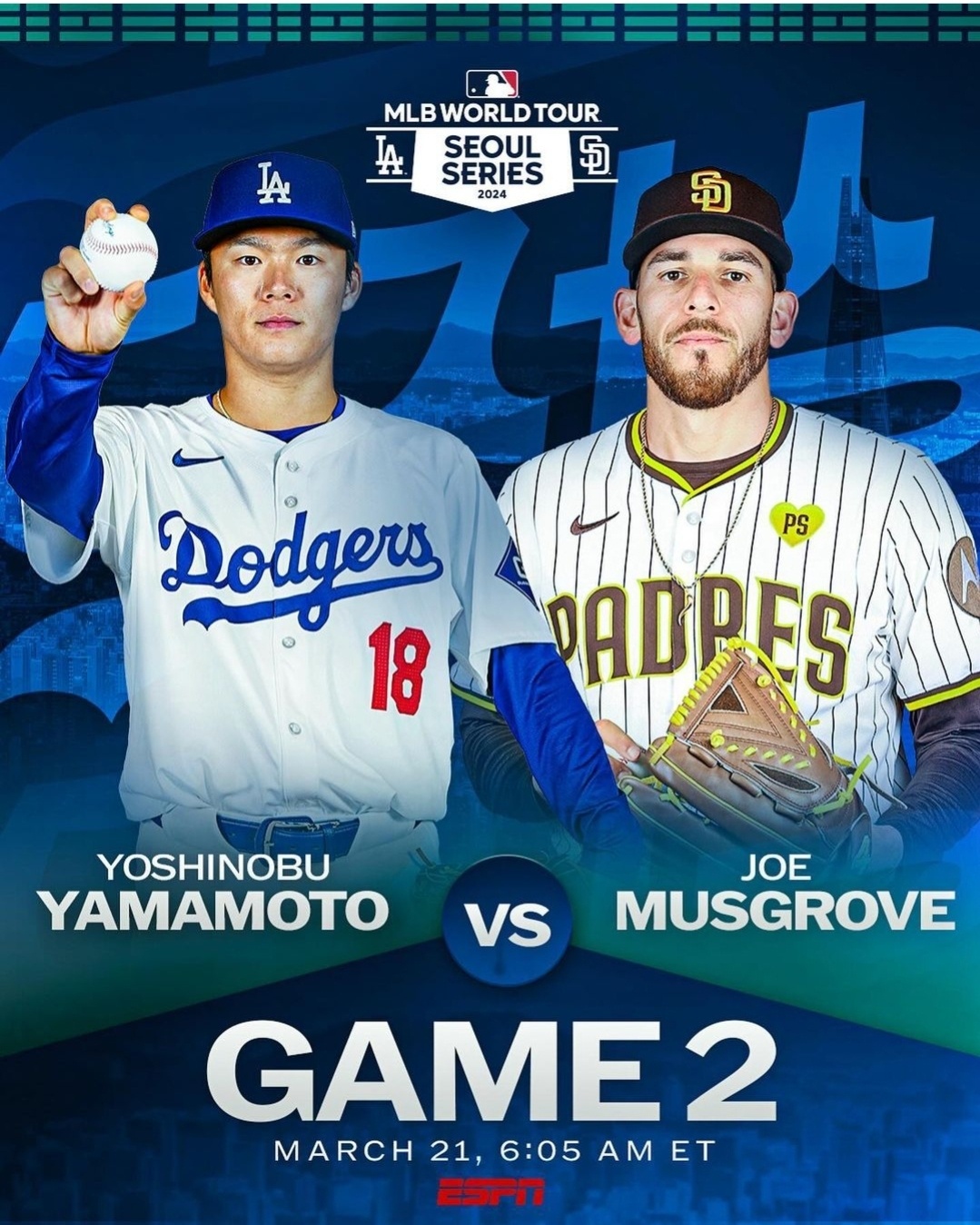 3월 21일 두번째 게임에서는 샌디에고 파드리스의 조 머스그로브와 LA다저스의 야마모토 요시노부가 각가 출격한다.