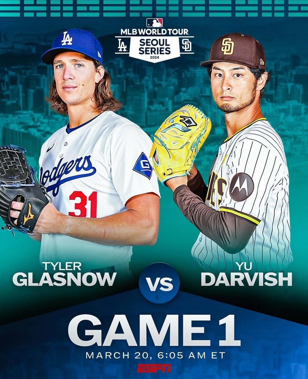 3월 20일 첫번째 게임에서는 LA다저스의 타일러 글래스노우와 샌디에고 파드리스의 다르빗슈가 유가 각각 출격한다.